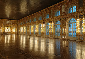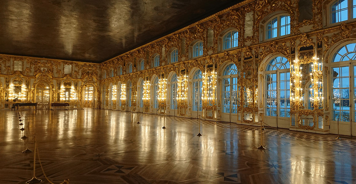 エカテリーナ宮殿は内部を琥珀で覆いつくした「琥珀の間」や日本ではかの大黒屋光太夫が訪れ帰国をお願いしたといわれている『謁見の間』があまりにも有名。「琥珀の間」は第二次世界大戦でナチス・ドイツに奪われ、琥珀は今も行方がわかりません。現在の琥珀の間は2003年、サンクトペテルブルグ建都300年記念に合わせて再現されたもの。着工から実に24年の歳月をかけて作られました。伝説となっていた「琥珀の間」が再現されたことにより世界中から観光客があつまる人気スポットとなりました。『謁見の間』は金箔を貼った彫刻と鏡がはりめぐらされた絢爛豪華な大広間。1791年、伊勢の商人でロシアに漂着した大黒屋光太夫はこの広間でエカテリーナ2世に謁見、帰国を願い出て許されました。夏の宮殿として建てられたエカテリーナ宮殿は窓が多く、ガラスがふんだんに使われていて中はどの部屋もとても明るい印象を受けます。華麗な内装と豪華な調度品で満たされた宮殿の内部は、まさにロシア帝国の栄華を体感できる場所です。
